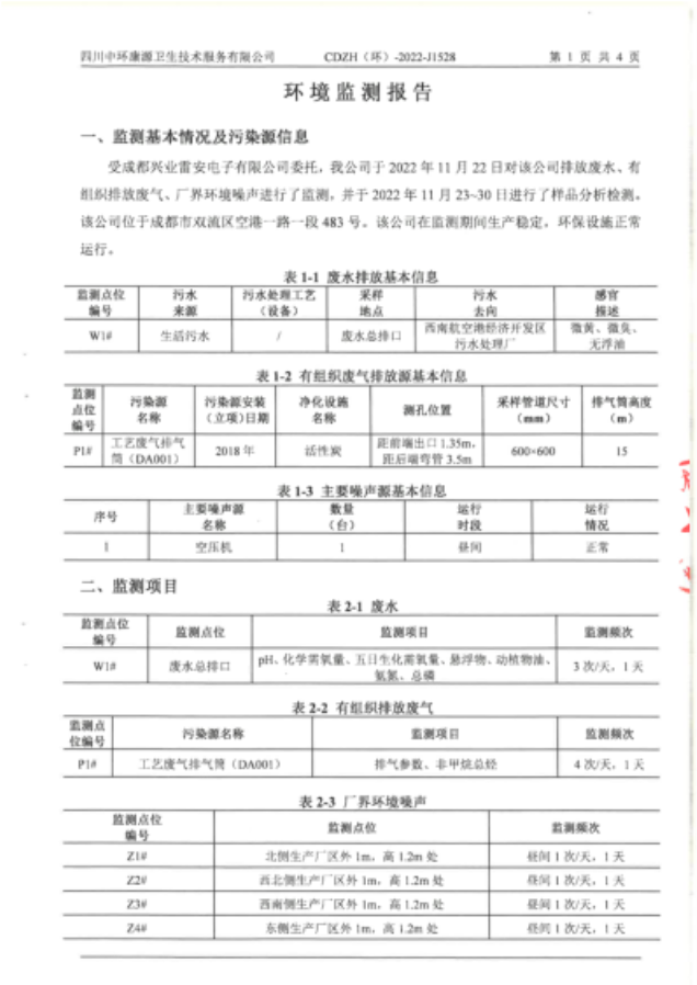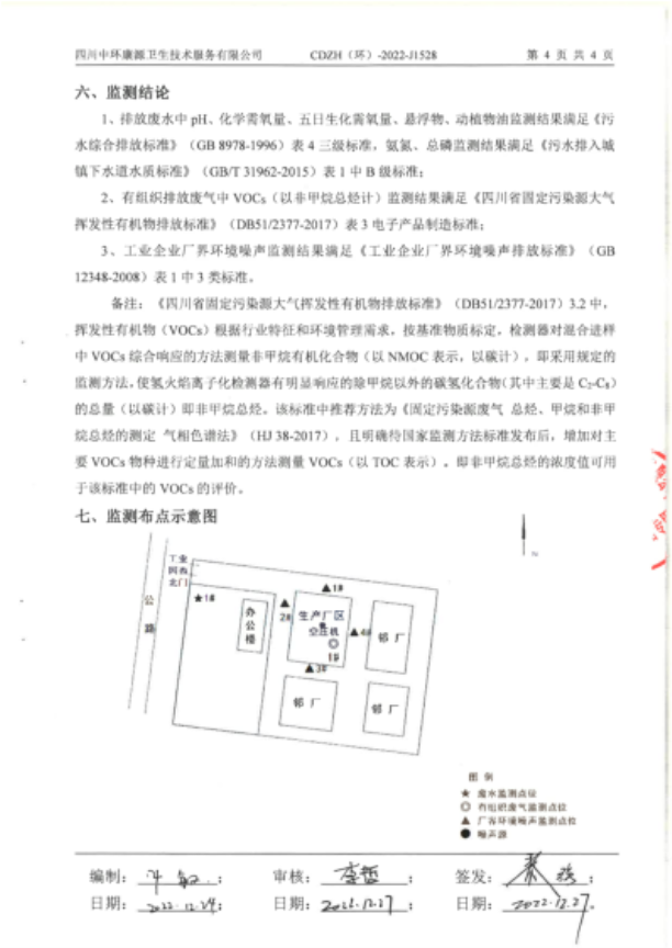 1、有组织排放废气中VOCs监测结果满足《四川省固定污染源大气挥发性有机物排放标准》(DB51/2377-2017)表3电子产品制造标准。